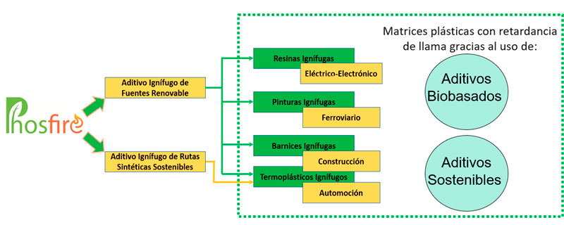 El aditivo ignífugo obtenido a partir de materias primas de fuentes renovables será el principal producto para desarrollar, a partir de él, tal y como se muestra en la Figura A, se desarrollarán 4 demostradores: paneles radiantes, bandejas portacables, tuberías termoplásticas, resinas y gel-coats y pinturas. Los materiales obtenidos se podrán emplear en los siguientes sectores: construcción, eléctrico-electrónico, automoción y ferroviario. El aditivo retardante de llama sintético será testado para el desarrollo de matrices poliméricas intrínsecamente ignífugas.