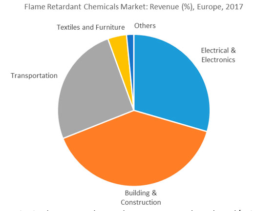 El consumo mundial de retardantes de llama asciende a más de 2,25 millones de toneladas por año, de los cuales el 20% está constituido por retardantes de llama de fósforo. Según un estudio de mercado, el consumo de plásticos ignífugos ha crecido a una tasa global anualizada del 9% entre 2015 y 2020, con aplicaciones principalmente ubicadas en transporte, construcción, equipos eléctricos y electrónicos (EEE) y muebles. (Figura B) Además, los retardantes de llama de fósforo se consideran alternativas adecuadas para los FR halogenados y posiblemente los reemplazarán debido a sus restricciones cada vez mayores